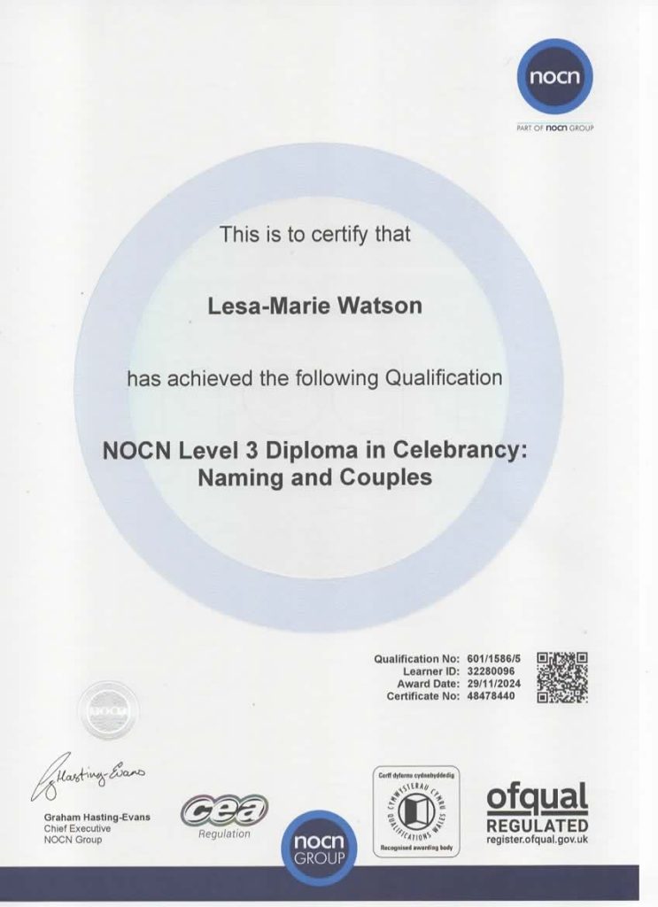 We’re proud to hold the NOCN Level 3 Diploma in Celebrancy: Naming and Couples. This recognised qualification reflects our commitment to delivering meaningful, personalised ceremonies. Whether it’s a naming day or a celebration of love, we bring care, creativity, and professionalism to ensure your special moments are truly unforgettable.